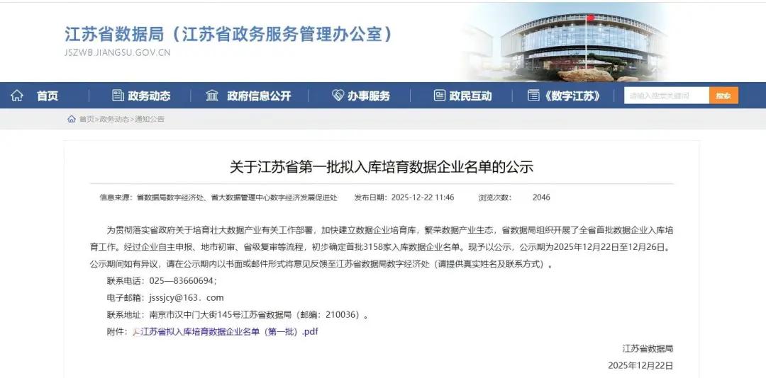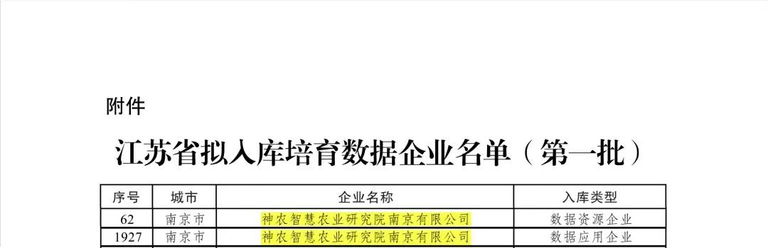 近日,江苏省数据局发布《关于江苏省第一批拟入库培育数据企业名单的公示》,神农智慧农业研究院南京有限公司成功入选数据资源企业与数据应用企业双类别。
