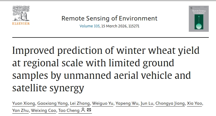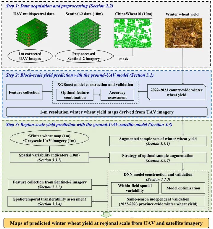 图3. 融合多光谱无人机与卫星数据的区域尺度冬小麦产量预测技术流程。
