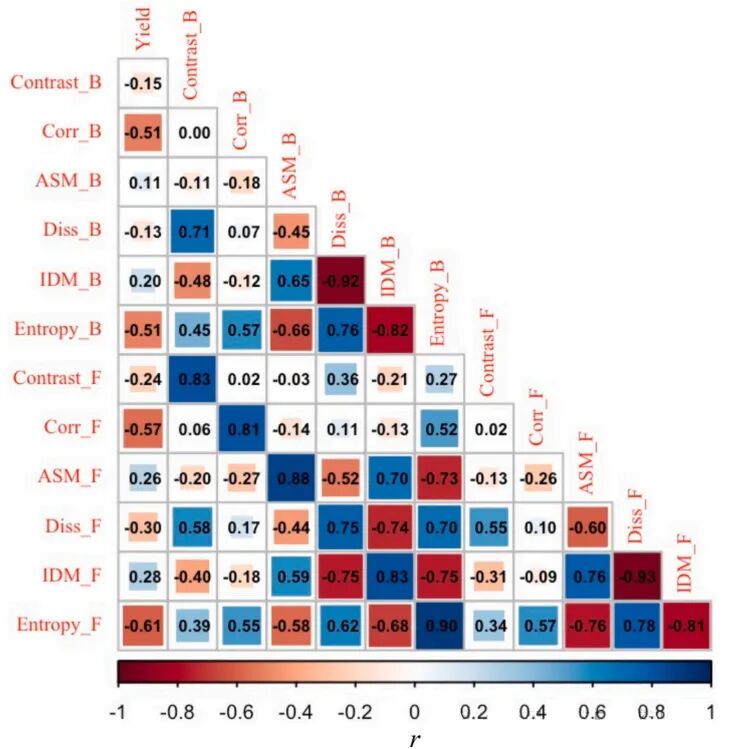 图8.2022–2023 年样本增强后冬小麦产量与 12 个空间变异指标的皮尔逊相关系数(r)(n=75154)其中 6 个指标标注 “_B” 对应拔节–抽穗期,6 个标注 “_F” 对应开花–灌浆期。因对角线对称,仅展示下三角部分。彩色相关系数 r 表示具有统计学显著相关性(p<0.05)。