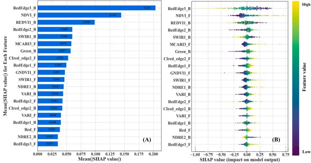 图7.平均 SHAP 值;(B)SHAP 汇总图。(标注 “B” 表示拔节–抽穗期,“_F” 表示开花–灌浆期;植被指数以 “1”“2”“3” 结尾分别表示由 Sentinel-2 红边波段 1、2、3 计算得到。)。