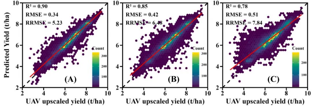 图10.3 种组合条件(组合 1–3)下地面–无人机–卫星 DNN 模型在 6 个县的冬小麦产量预测精度(A)组合 1:熵值_F 区间为睢宁 0–0.4、如皋 0–0.5、淮安 / 兴化 / 吴江 0–0.6、灌云 0–0.7;(B)组合 2:熵值_F 区间为睢宁 0–0.5、如皋 0–0.6、淮安 / 兴化 / 吴江 0–0.7、灌云 0–0.8;(C)组合 3:熵值_F 区间为灌云 / 淮安 / 睢宁 / 兴化 / 如皋 / 吴江均为 0–0.4。为保证客观评估,从每个县随机抽取 2000 个样本作为测试集,所有组合使用同一测试集。