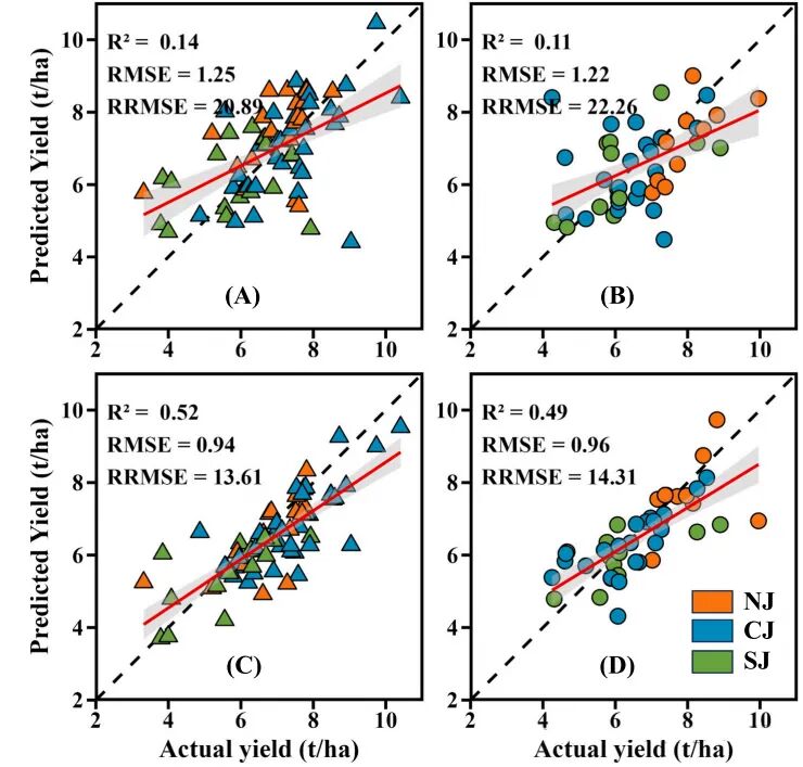 图13.基于全省地面实测的(A–B)地面–卫星 DNN 模型与(C–D)最优地面–无人机–卫星 DNN 模型冬小麦预测可迁移性对比三角形为 2021–2022 年共 69 个样本,圆形为 2023–2024 年共 44 个样本;橙色、蓝色、绿色分别代表苏北(NJ)、苏中(CJ)、苏南(SJ)。