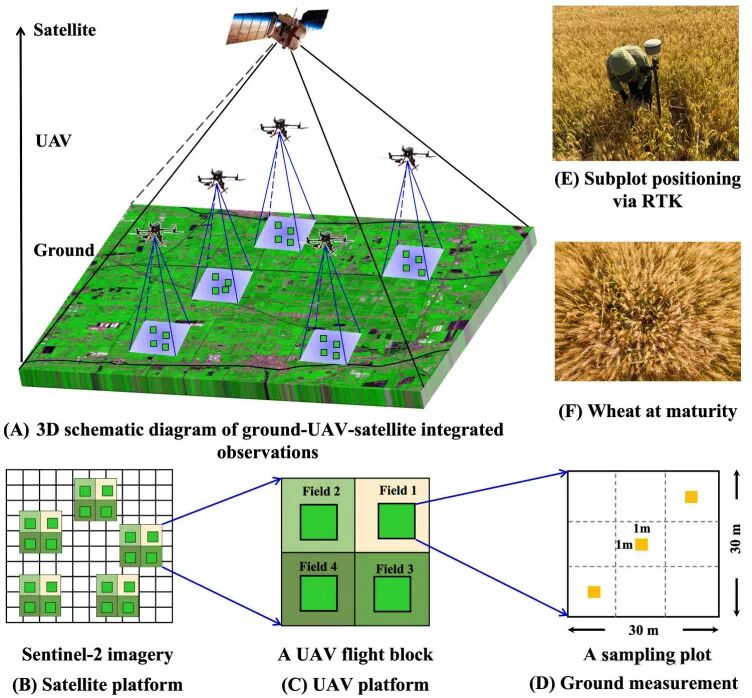图2.地面–无人机–卫星升尺度流程示意(A)冬小麦田地面–无人机–卫星观测三维示意图;(B)为开展 5 次无人机航测的各县 Sentinel-2 卫星影像;(C)单次无人机航测覆盖 4 个样方,总面积约 16 公顷;(D)野外每个样方面积为 30 m × 30 m,内含 3 个 1 m × 1 m 测产小样方;(E)冬小麦(F)成熟期采用实时动态定位(RTK)记录每个小样方中心坐标。