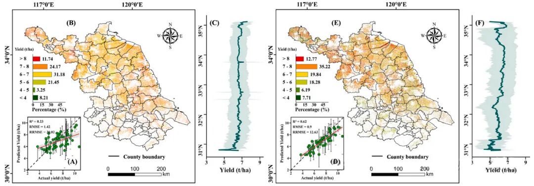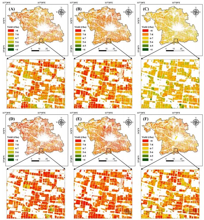 图15.睢宁县(A–C)地面–卫星 DNN 模型与(D–F)最优地面–无人机–卫星 DNN 模型冬小麦产量预测图(A)、(D)2021–2022 年;(B)、(E)2022–2023 年;(C)、(F)2023–2024 年。