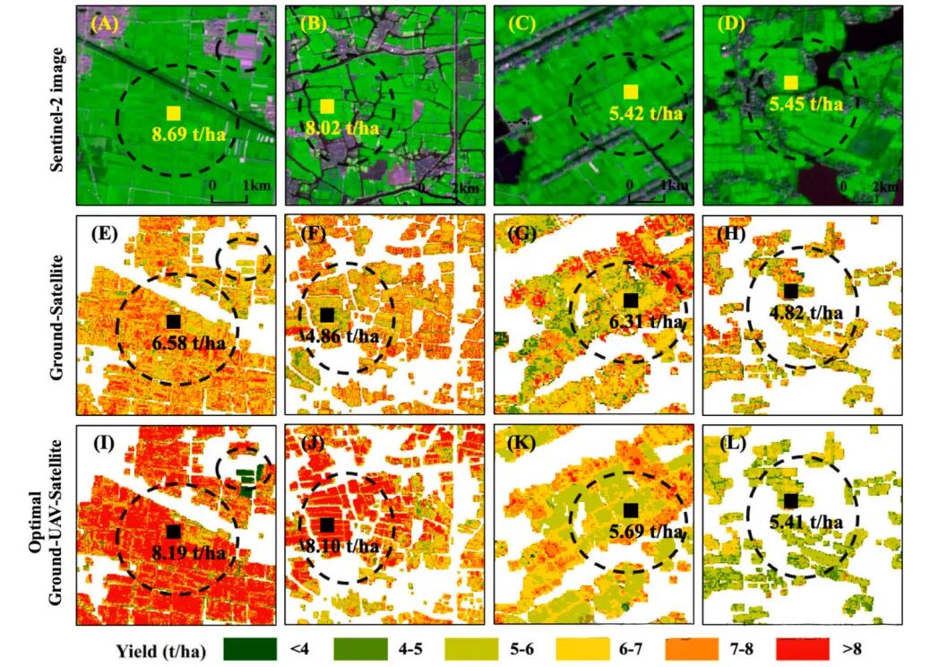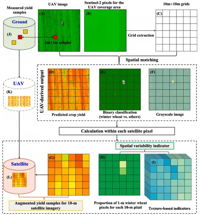 图4.基于无人机影像与卫星像元匹配的样本增强及跨尺度模型校正步骤示意(睢宁区块部分结果)(A)、(B)为同一区域无人机影像与匹配 Sentinel-2 影像示例(假彩色合成,红:蓝波段,绿:近红外波段,蓝:红波段);(C)为与卫星像元对齐的 10 m × 10 m 网格提取;(D)–(F)分别为冬小麦产量预测结果、冬小麦像元提取结果、与卫星像元空间匹配的无人机影像灰度图;(G)–(I)为各卫星像元内冬小麦产量及空间变异指标计算;(J)、(K)分别为地面实测产量数据集与无人机反演产量数据集;(L)为基于无人机–卫星协同的样本增强后产量数据集。