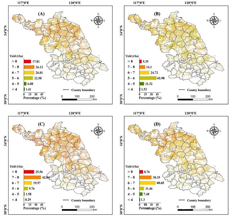 图14.两季江苏省冬小麦产量预测空间分布图:(A–B)地面–卫星模型;(C–D)最优地面–无人机–卫星 DNN 模型左列为 2021–2022 季,右列为 2023–2024 季;图中柱状图为各产量等级对应面积占比。