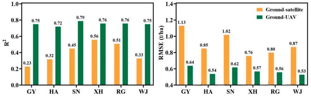 图5.2022–2023 年基于留一交叉验证(LOOCV)的地面–卫星模型与地面–无人机模型在 6 个县冬小麦产量预测中的(A)决定系数 R² 与(B)均方根误差 RMSE 对比。